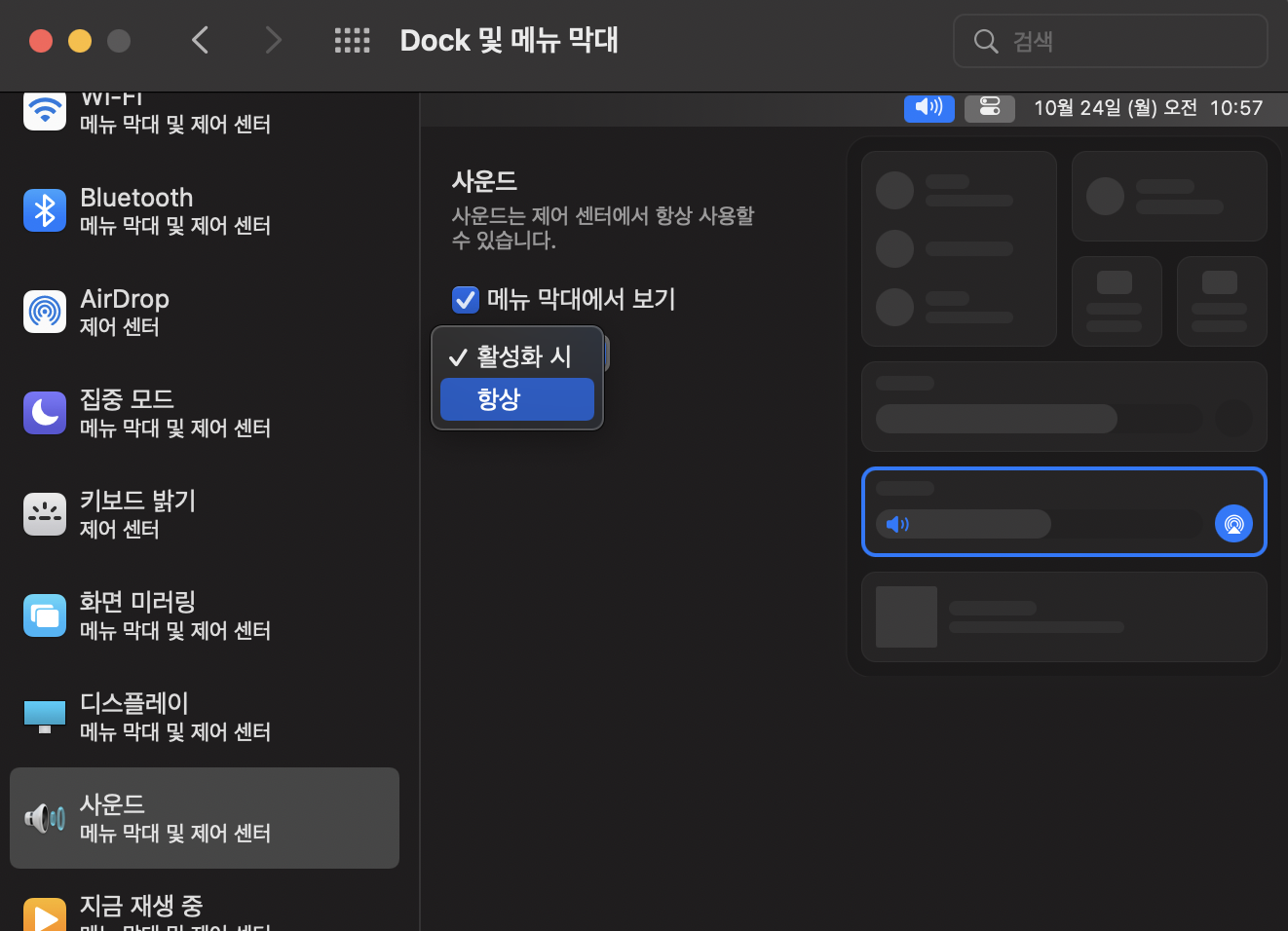 이 설정은 시스템 환경 설정에서 Dock 및 메뉴 막대를 선택하고 사운드 부분을 항상 표시로 변경하면 된다.