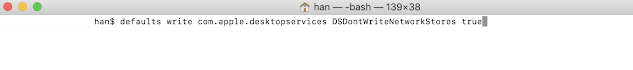 이 커맨드는 .DS_Store 파일을 네트워크 폴더에 생성하지 않도록 설정한다. 유저별로 설정되므로, 관리자 권한이 없어도 사용할 수 있다.