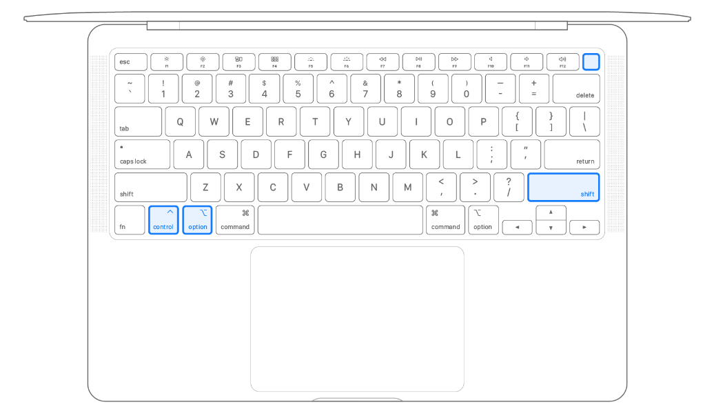 2. 오른쪽 Shift키 + 왼쪽 Control키 + 왼쪽 Option 키를 누룬 상태에서 전원 버튼을 함께 약 5-7초간 누르고 있는다.