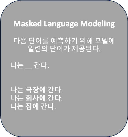 BERT모델에서 사용 가능한 사전 학습 모델로, MLM(Masked Language Modeling)은 [MASK] 이전, 이후 정보를 모두 활용하여 사전 학습을 하는 양방향 학습 구조를 가진다.