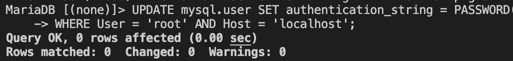 UPDATE mysql.user SET authentication_string = PASSWORD('NEW_PASSWORD') WHERE User = 'root' AND Host = 'localhost';