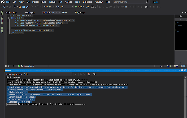 그리고 빌드를 진행하면, 빌드이후 Obfuscar가 난독화를 정상적으로 진행하는 것을 확인할 수 있다.