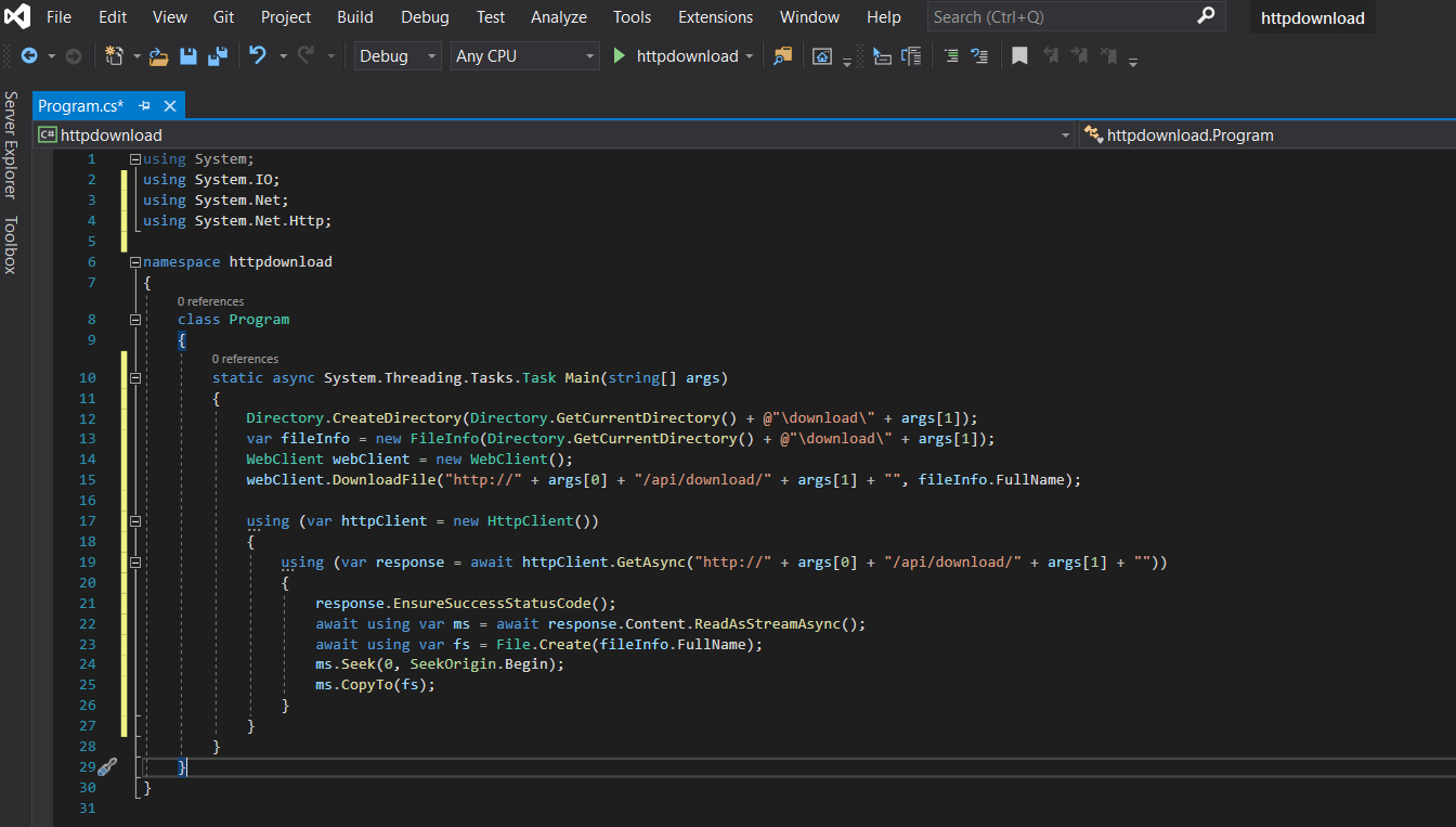 using (var response = await httpClient.GetAsync("http://" + args[0] + "/api/download/?filename=" + args[1] + ""))