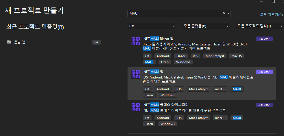 이후 기능 추가를 통해서 .NET MAUI 6.0 기능을 추가하면 탬플릿에서 MAUI 템플릿을 통한 개발을 진행할 수 있다.
