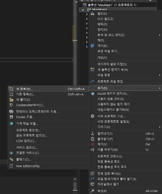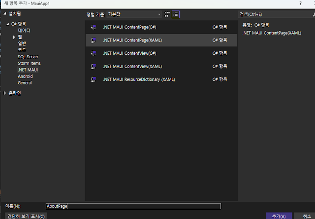 MAUI에서 신규 페이지를 만들기 위해서는 내부 어셈블리 등록을 위해 아래와 같이 신규 아이템을 추가하는 방식으로 진행하면 된다. 이후 .NET MAUI를 선택하고, ContentPage 타입(XAML)를 선택하자.