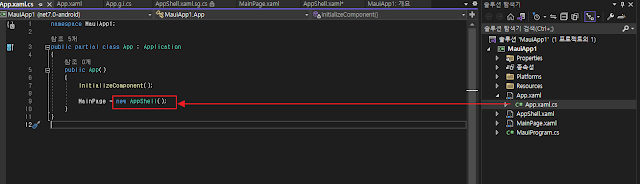 기본 프로젝트의 시작점인 App.xaml.cs를 확인해 보면, AppShell()을 MainPage로 실행하는 것을 알 수 있다.