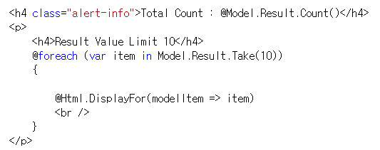 <h4 class="alert-info">Total Count : @Model.Result.Count()</h4>