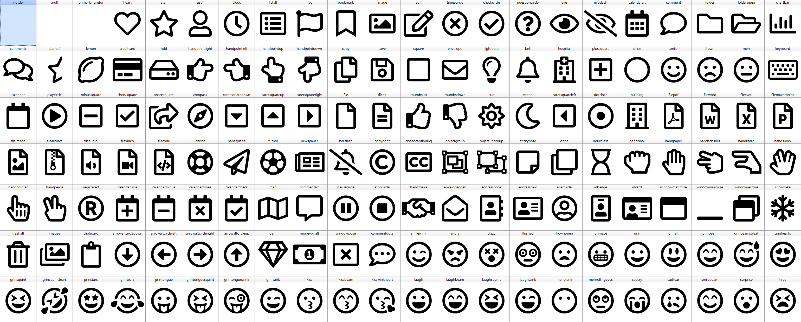 필자가 각 폰트별로 제공되는 아이콘 전체를 캡처해 두었으니 어떤 아이콘이 있는지 간략히 확인해 보면 적용전 도움이 될 것이다.