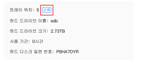 만약 구성한 디스크중에 문제가 발생하면, 디스크 상태 메뉴에서 아래와 같이 오류 를 확인할 수 있다.