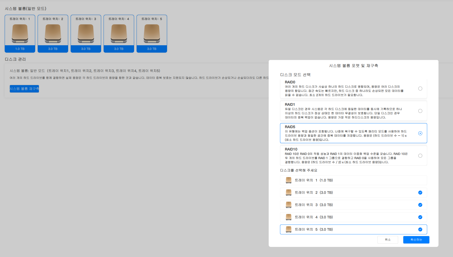 말이 길었고, 필자는 2,3,4,5 트레이를 시스템 볼륨으로 RAID5로 구성하였다.