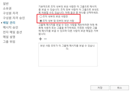그룹 메일을 외부 사용자가 사용할 수 없도록 하거나, 외부에서 사용할 수 있도록 설정을 해야 하는 경우가 종종 발생하는데, 이때 아래와 같이 배달 관리에서 가능하다.