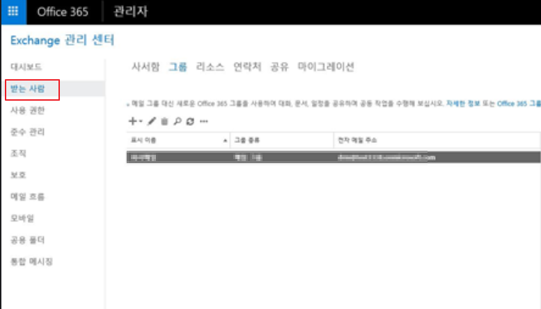 배달 관리는 Exchange 관리 센터 에서 받는 사람 > 그룹 에서 확인이 가능하다.