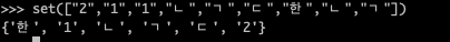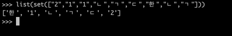 >>> set(["2","1","1","ㄴ","ㄱ","ㄷ","한","ㄴ","ㄱ"])