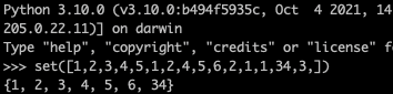 >>> set([1,2,3,4,5,1,2,4,5,6,2,1,1,34,3,])