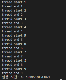 기본 실행시간은 1초가 걸리지 않고 이후 쓰레드에서 작업을 처리하면 전체가 완료되는 시간이 10초가 걸리게 된다.