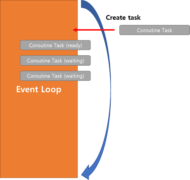 이벤트루프는 코루틴을 하나의 테스크(task)라고 하면 이를 리스트로 등록하고 태스크를 관리하는 개념이다.