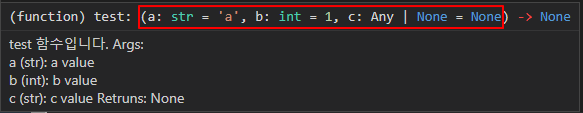 그리고 함수 설명에도 어떤 타입(유형, str, int등 인자값 종류)의 인지 값인지 쉽게 확인이 가능하다.