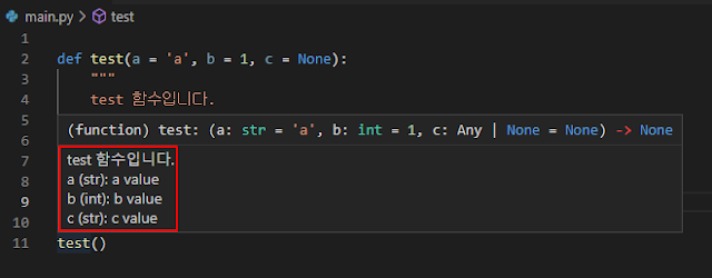 아래와 같이 test 함수가 있다고 치자. 여기에 설명을 달고자 한다면, 쌍따옴표 3개를 이용해서 감싸고 원하는 설명을 넣으면 된다.