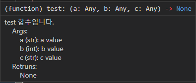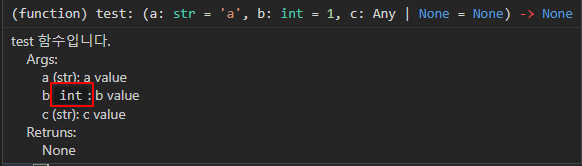 그리고 함수 설명에도 어떤 타입(유형, str, int등 인자값 종류)의 인지 값인지 쉽게 확인이 가능하다.