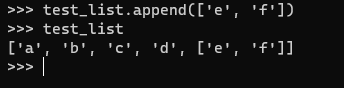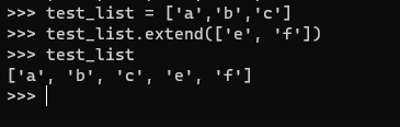 extend를 이용해서 위 e, f를 넣어보도록 하자. append와 다르게 기존 리스트에 e와 f가 순서적으로 들어간 것을 알 수 있다.