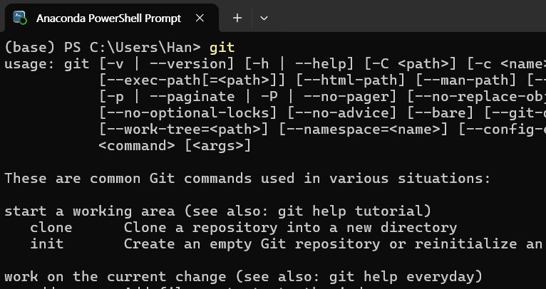 실행하고 git이 잘 동작하는지 확인해보면 특별한 문제가 없는 이상 아래와 같이 git 명령이 이용할 수 있을것이다.