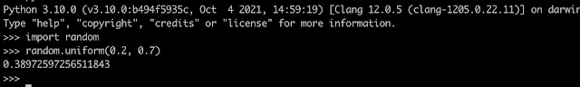 >>> random.uniform(0.2, 0.7)