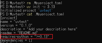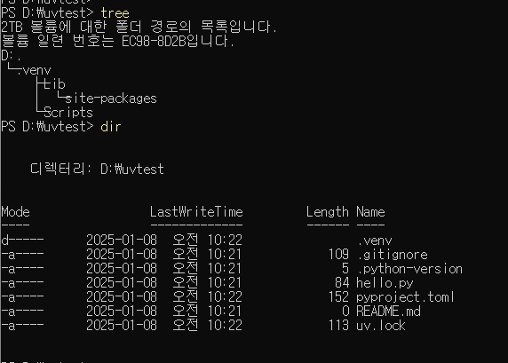 그리고 필자는 uvtest라는 폴더를 미리 만들었는데, 이경우 uv init를 통해 현재 경로를 프로젝트 경로로 사용하게 된다.