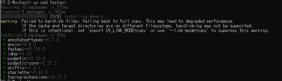추가로 간혈적으로 라이브러리에 추가 옵션이 붙는 경우를 보았을 것이다. 대표적으로 fastapi와 많이 사용하는 uvicorn이 있는데, pip를 이용할 경우에는 "uvicorn[standard]" 명령을 사용하였는데, uv에서는 --extra 옵션을 사용해서 해결할 수 있다.
