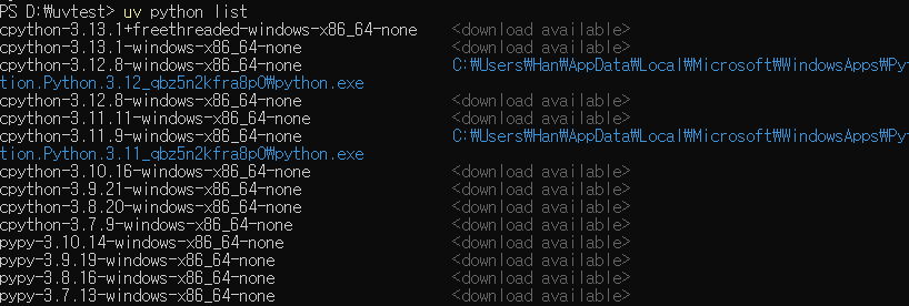 uv python list를 이용하면 현재 설치된 Python 목록과 설치가 가능한 버전들을 확인 할 수 있다.