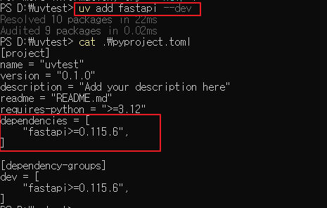 그리고 pyproject.toml 을 위해서 빌드를 생각한다면, 마지막에 개발 의존성 옵션인 --dev 를 입력하면 pyproject.toml 과 uv.lock에 해당 라이브러리를 기록하여, 추후 빌드, 배포등을 관리할 수 있도록 도움을 준다.