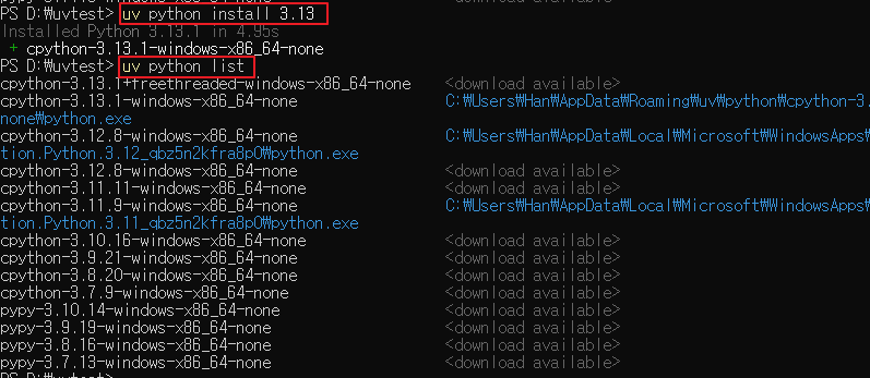 uv python install 명령을 이용해서 Python을 추가로 설치하고 싶다면, 설치가 가능하다. 3.13 과 같이 버전 두번째 자리까지 작성하면 해당 버전의 안정화 버전으로 List 명령으로 확인된 기준으로 설치된다. 그럼 python 3.13 버전을 설치해 보자.
