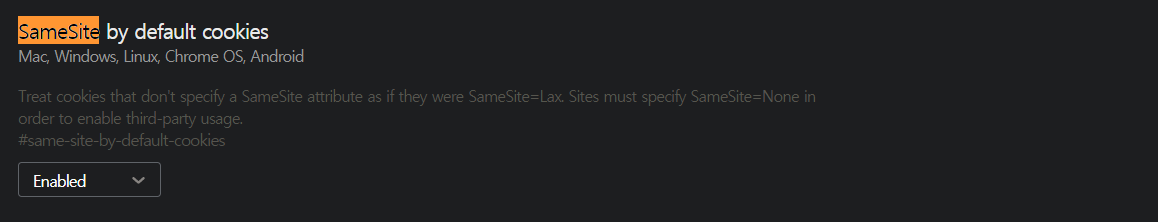 그리고 chrome://flags 에서 SameSite 옵션을 사전에 활성화하여 확인 할 수 있다. SameSite by default cookies 를 선택하면 Lax 모드를 선택한 것과 동일하다.