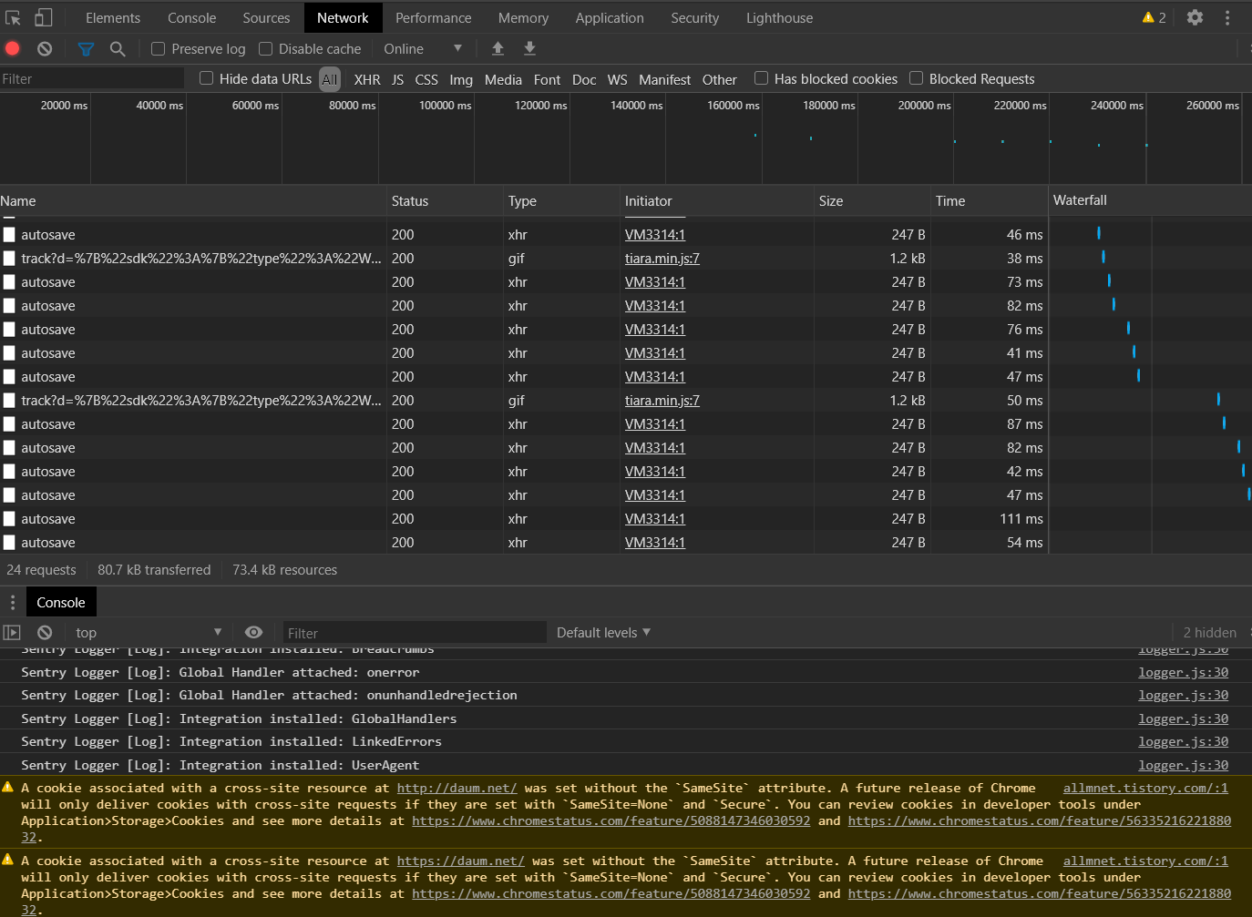 현재 크롬 77버전 이상부터는 Samesite Cookie 기능을 사용하지 않았을 때 발생할 수 있는 문제에 대한 경고를 개발자 모드(F12키)에서 보여주고 있다. 해당 내용은 F12키 -> Network 탭에서 오류코드로 확인이 가능하다.