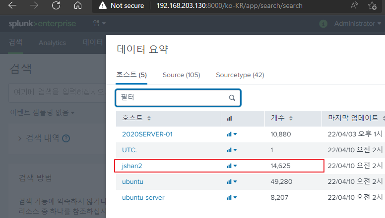 데이터 전달이 잘 되는지 Splunk로 들어가 확인해보면 잘 입력되는 것을 알 수 있다.
