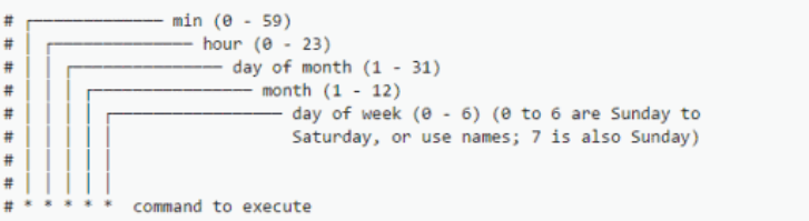 Crontab은 기본적으로 6개의 시간 값이후에 자신이 실행하고자 하는 명령을 입력하는 방식이며, 6개의 시간 값은 아래와 같은 의미가 있다.