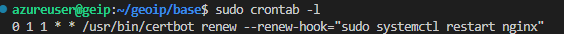 0 1 1 * * /usr/bin/certbot renew --renew-hook="sudo systemctl restart nginx"