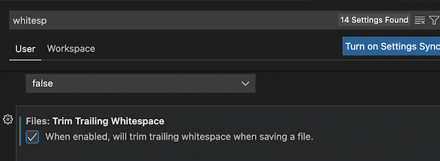 이를 활성화 하면, 이후 부터 아래와 같은 불필요한 공백으로 판단되는 마지막 공백들에 대해서 파일이 저장되는 시점에 제거 되어진다.
