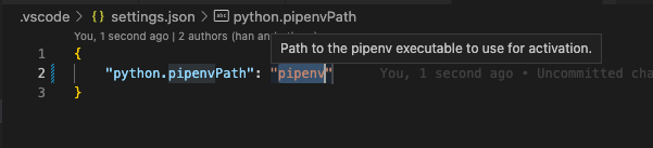 만약 프로젝트 세팅을 하고자 한다면, .vscode/settings.json을 만들고 python.pipenvPath 를 설정하여도 동일한 효과를 볼 수 있다.