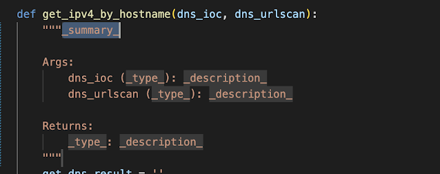 여기에서 엔터를 누르면, 현재 기준으로 함수 설명, 입력 값, 출력 값의 기본 포맷을 만들어 주어서 쉽게 설명을 작성할 수 있다.