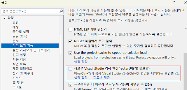 만약 이 기능을 끄고 싶다면 도구 > 옵션 > 환경 > 미리 보기 기능에서 체크 박스를 해제하면 기존 검색 기능을 사용할 수 있다.