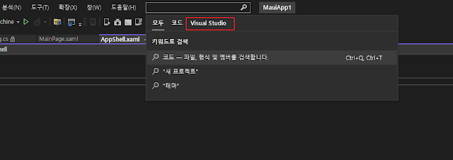 그리고 한번에 모두 검색하거나 기존과 같이 코드상 검색 혹은 Visual Studio 내 옵션, 메뉴등을 검색할 수 있는 기능을 선택할 수 있다.