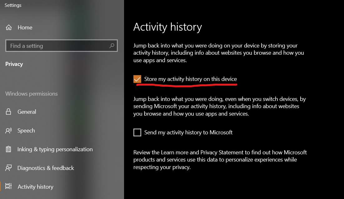 Windows 10의 경우 윈도우 제어판의 activity history라는 메뉴가 있는데 기본적으로 사용자의 웹 브라우저 이용이나 앱사용 기록을 저장하도록 설정이 되어 있다.