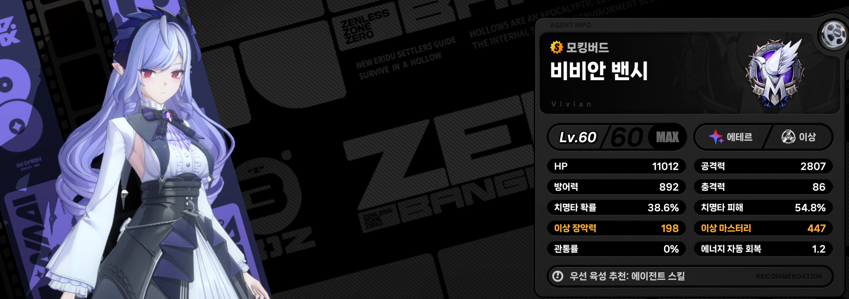 비비안은 속성 이상 피해량을 최대한으로 끌어올수 있는 이상 마스터리의 서브 딜러 겸 서포터라고 할 수 있습니다.