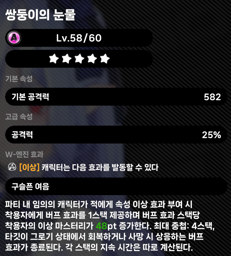 이렇게 45 +30 + 95 =170을 확보했다면 엔진을 통해 4성 엔진 기준 75를 확보할 수 있습니다. 만약 전용 엔진이 있다면 기본 90 + 120 을 확보할 수 있어서 강력하지만, 다른 엔진을 사용한다면, 쌍둥이의 눈물을 통해 최대 192를 획득할 수 있기 때문에 쌍둥이의 눈물을 추천합니다. (쌍둥이의 눈물을 이용해서는 버프를 받아야만 가능하기 때문에 기본 값을 400 넘기기 어려울 것입니다. 그래도 공격력을 부 옵션으로 챙길 수 있어서 서브 딜러로도 휼륭한 비비안에게 좋은 엔진입니다.)