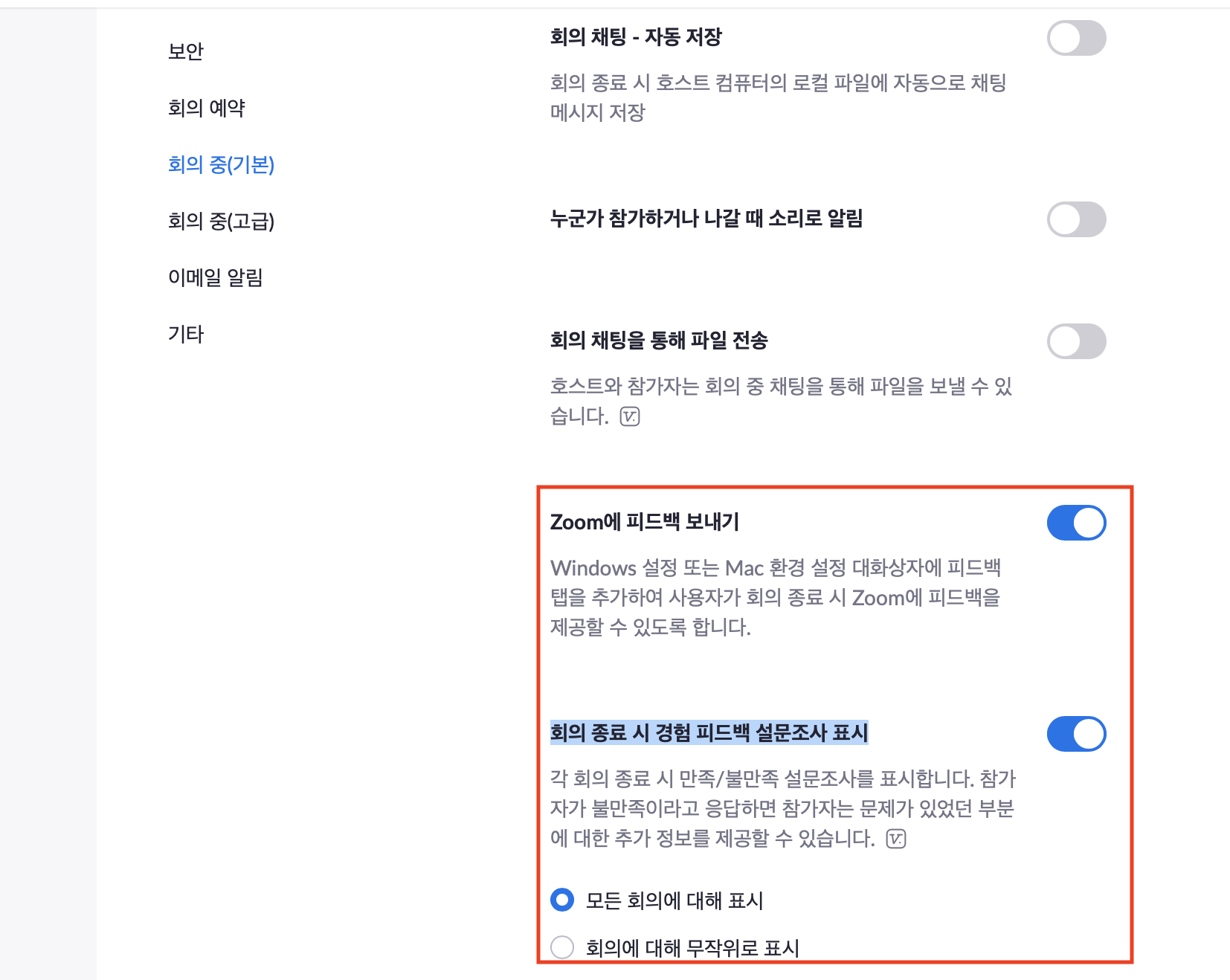 zoom.us/profile/setting?mid=&from=client 에 방문하여 Zoom 계정으로 로그인 하면 아래 와 같이 피드백을 비활성화가 가능하다.