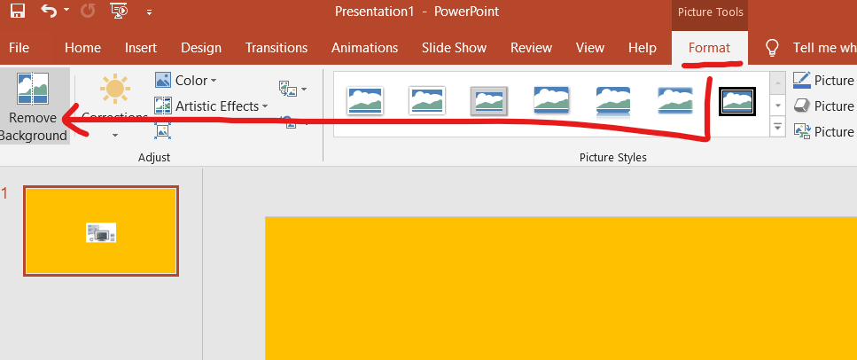 그림을 선택하고 포맷을 선택 하면, 배경 제거 버튼이 있는 것을 알 수 있다.