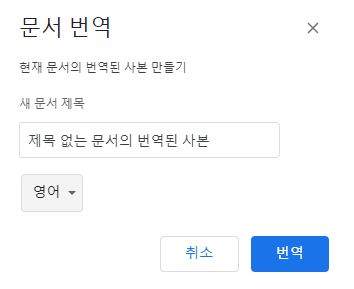 문서 번역을 누르면 번역한 문서의 이름과 현재 작성한 글를 번역될 언어를 지정하고 번역 버튼을 누르면, 새로운 문서에 번역된 내용를 저장하게 된다.