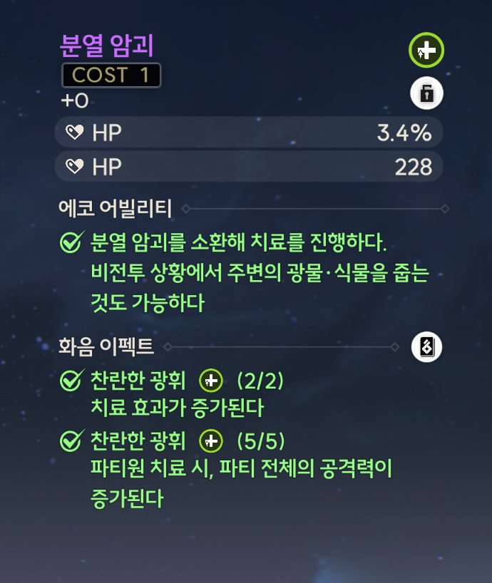 이외에도 필드의 유지타임이 작은 양양 역시, 공명 에너지를 회복하고 금희와 파티를 하더라도 나쁘지 않다.