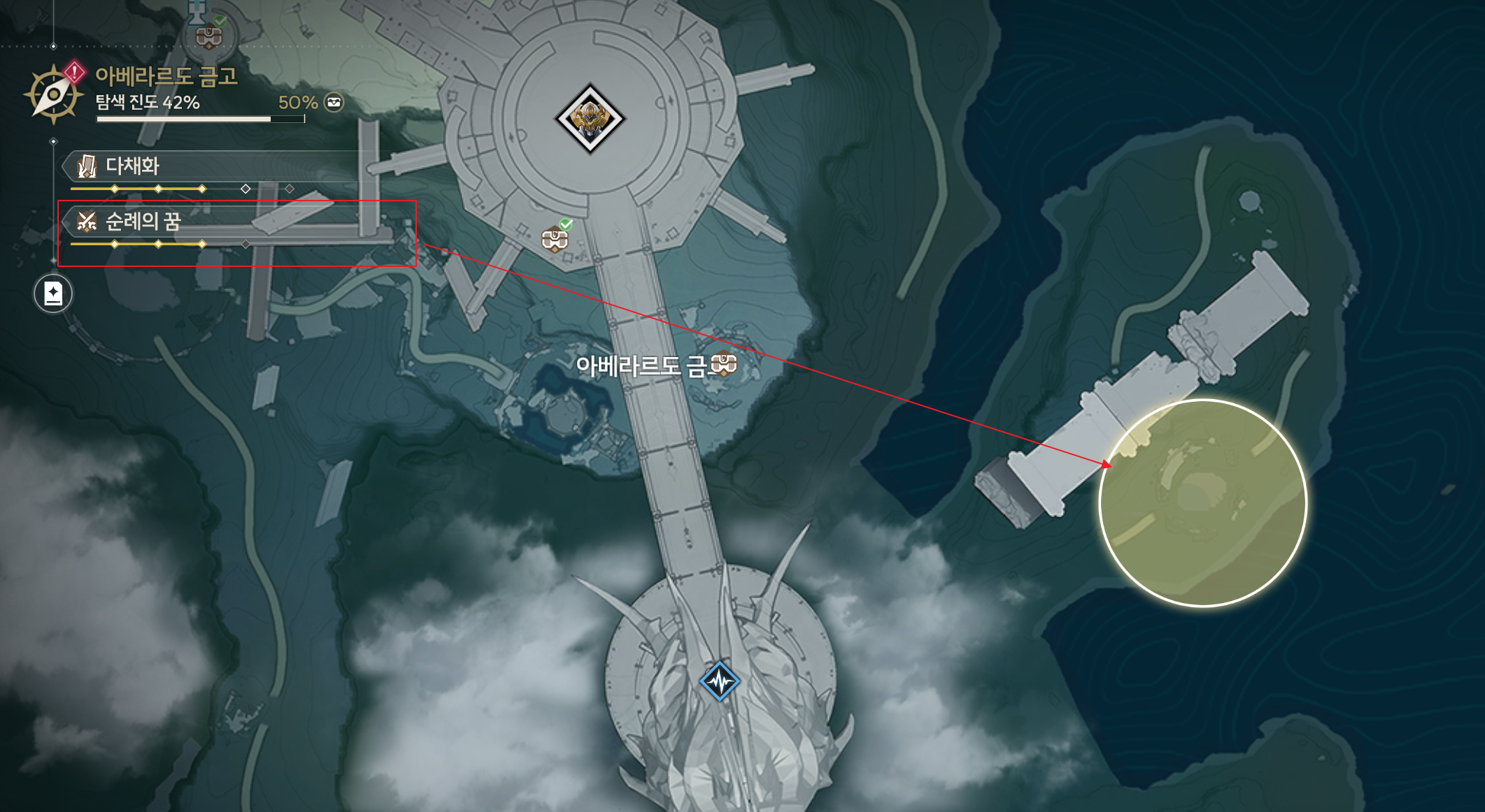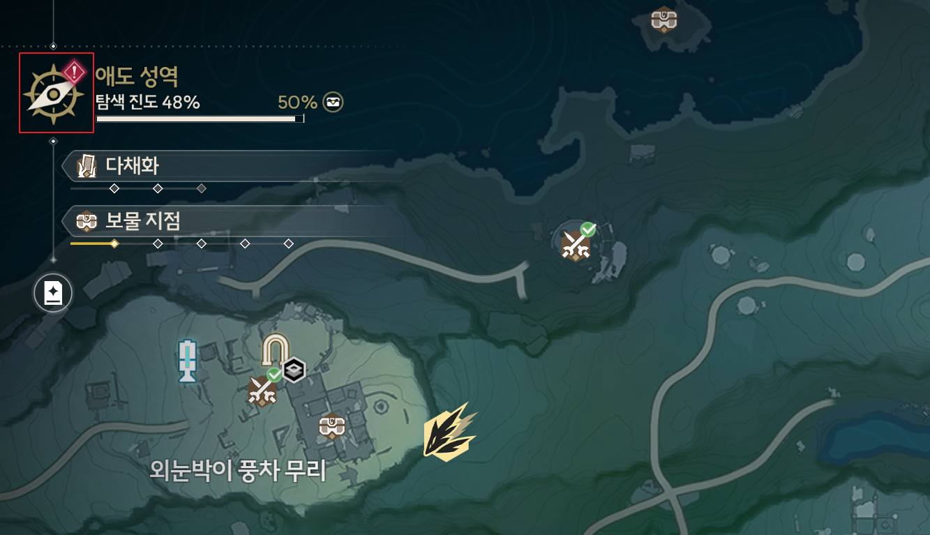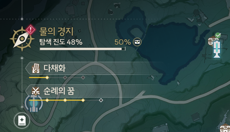 진행 기준은 플레이어가 위치한 지역을 기준으로 표시되기 때문에, 만약 필자가 물의 경지로 이동하면, 악몽 에코 출현을 위해서 해결해야 할 순례의 꿈을 표시해 준다.