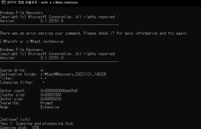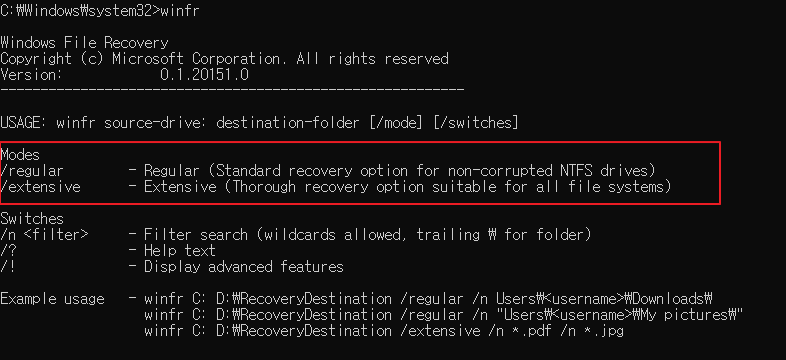 winfr <복구 드라이브명> <저장할 위치> <옵션>